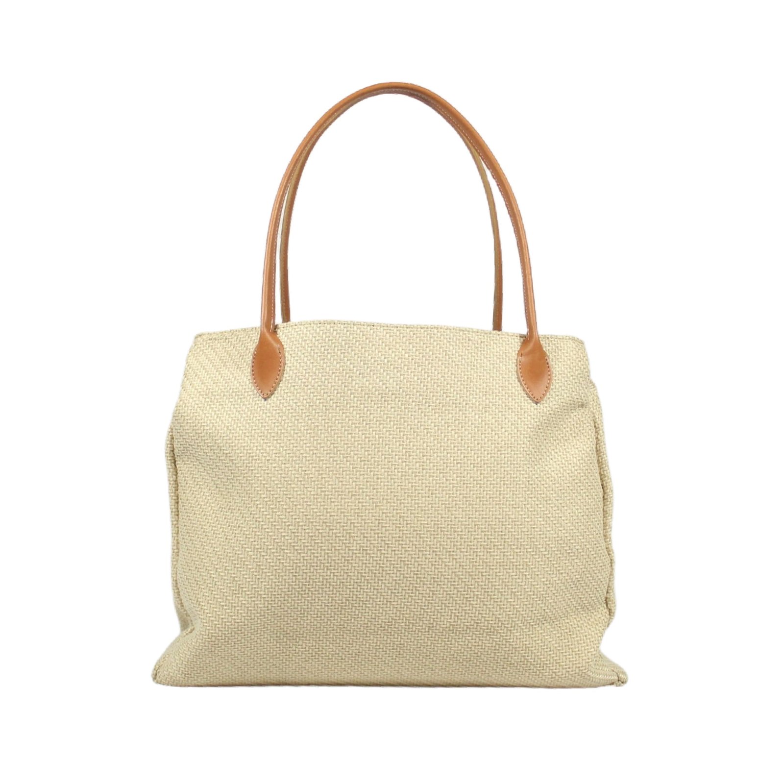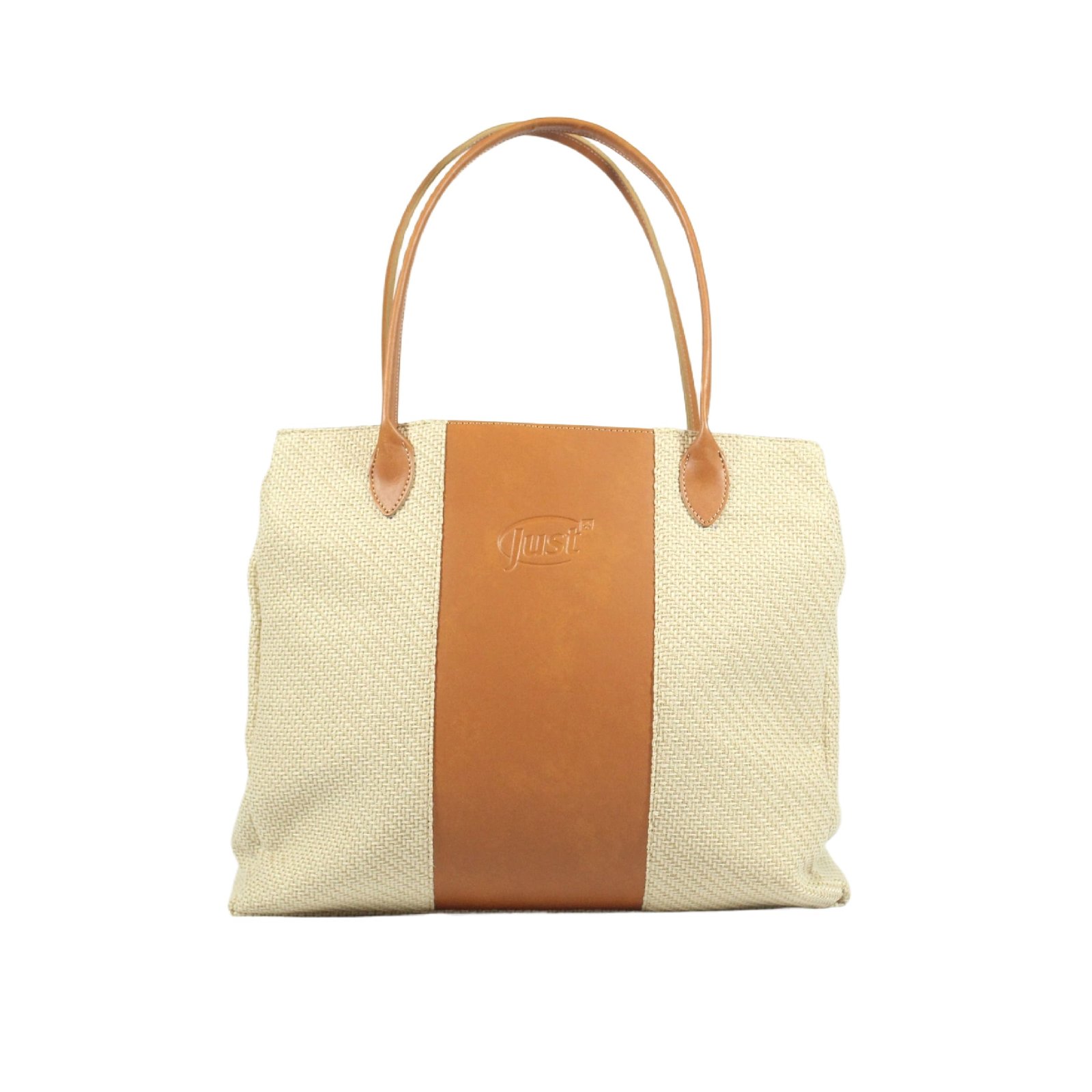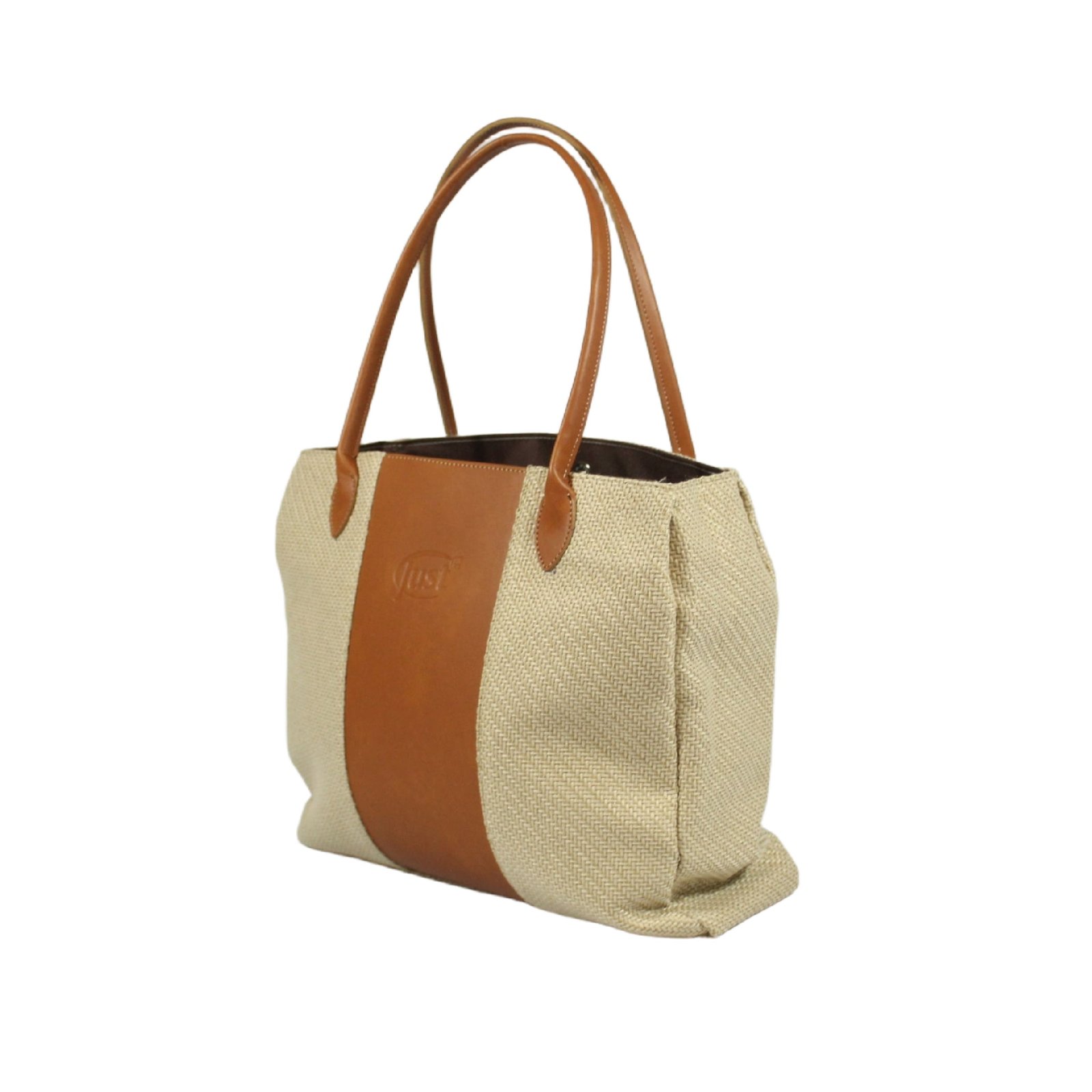 Bolsa en tela tipo yute con aplicación y asas en símil cuero tipo Malinche y grabado en alta frecuencia del logotipo empresarial.